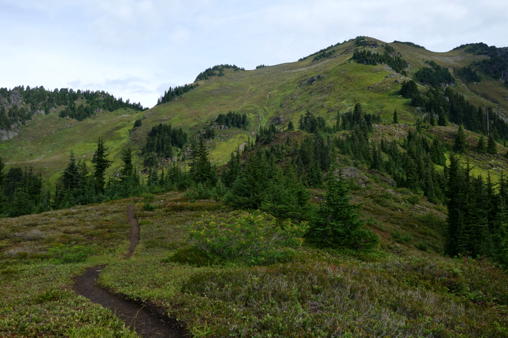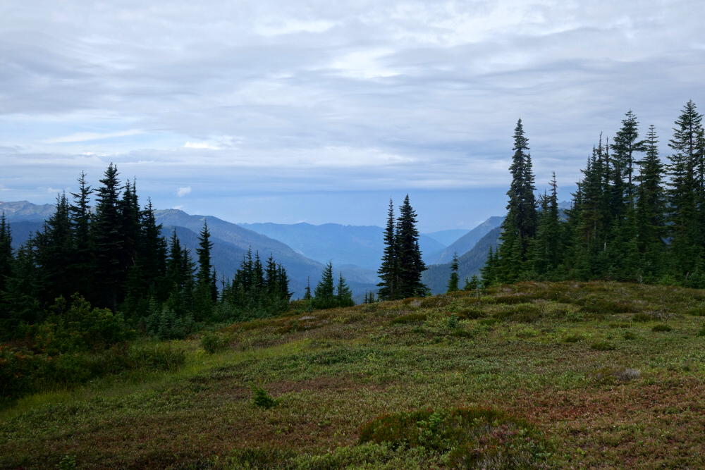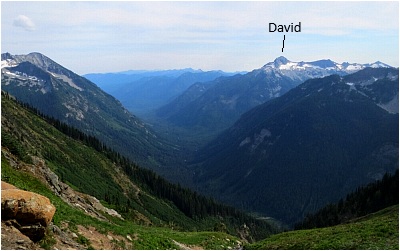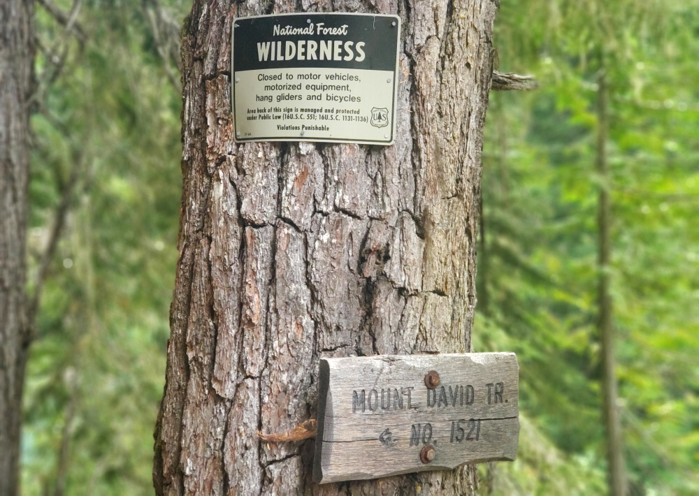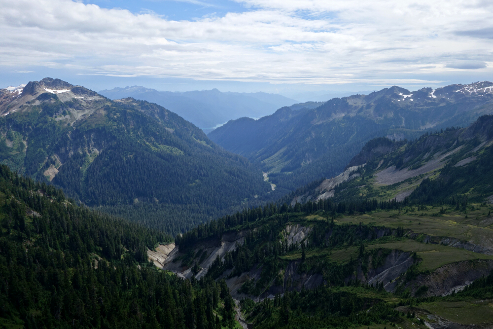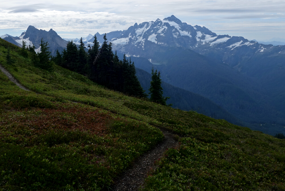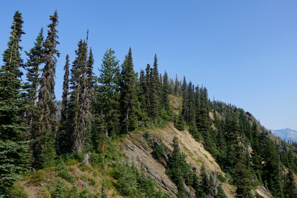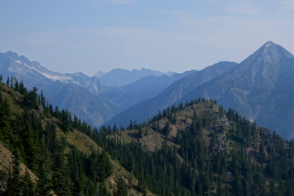 along the way as doing so has somehow eluded me all these years, before pulling into one of the campgrounds situated along the White River for the night. The sky was tinged with a distinctive orange hue, obviously thanks to forest fires burning somewhere nearby. This was punctuated by the occasional clap of thunder overhead and served as a reminder that the forecast for the next several days was for afternoon thunderstorms. Raised the camper pop-top and turned in early hoping to get a jump on whatever weather instabilities were in the offing. Completed the short drive to the trailhead the following morning and set out across the footbridge spanning White River before turning left on the Mount David Trail. South along the river for ~1.5 kilometers before turning up for a steep grind to reach a low point on David's long SE Ridge. Tight switchbacks towards the top really got the blood pumping with trees beginning to thin and allowing for nice views overlooking White River Valley and peaks beyond.