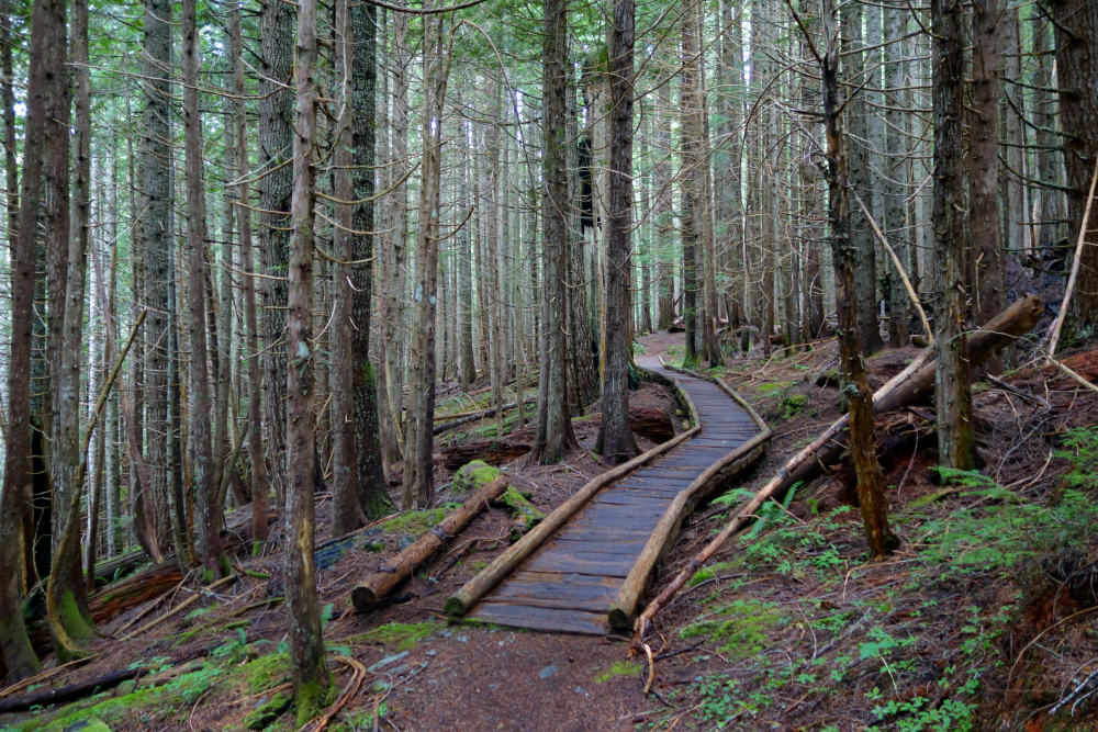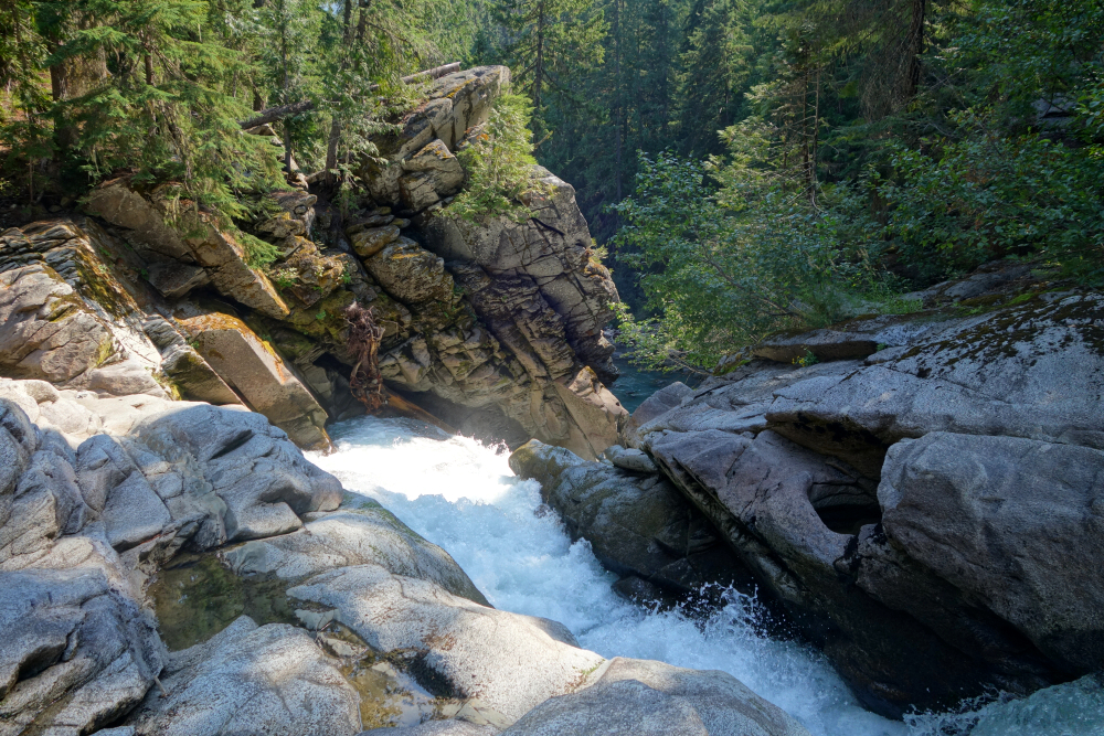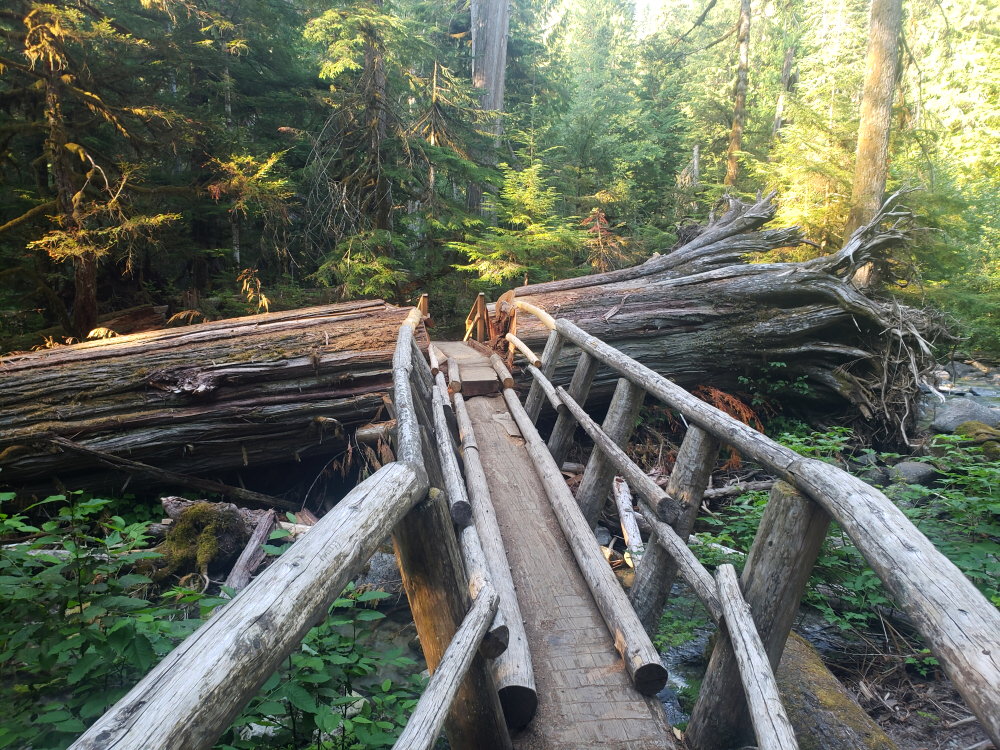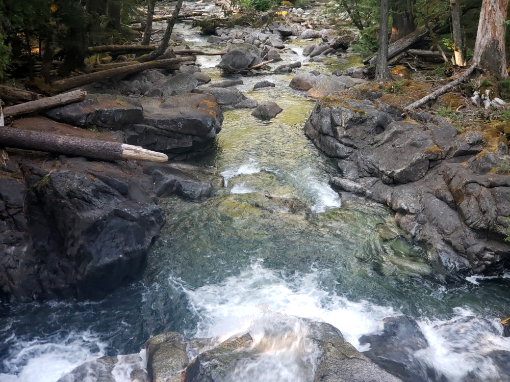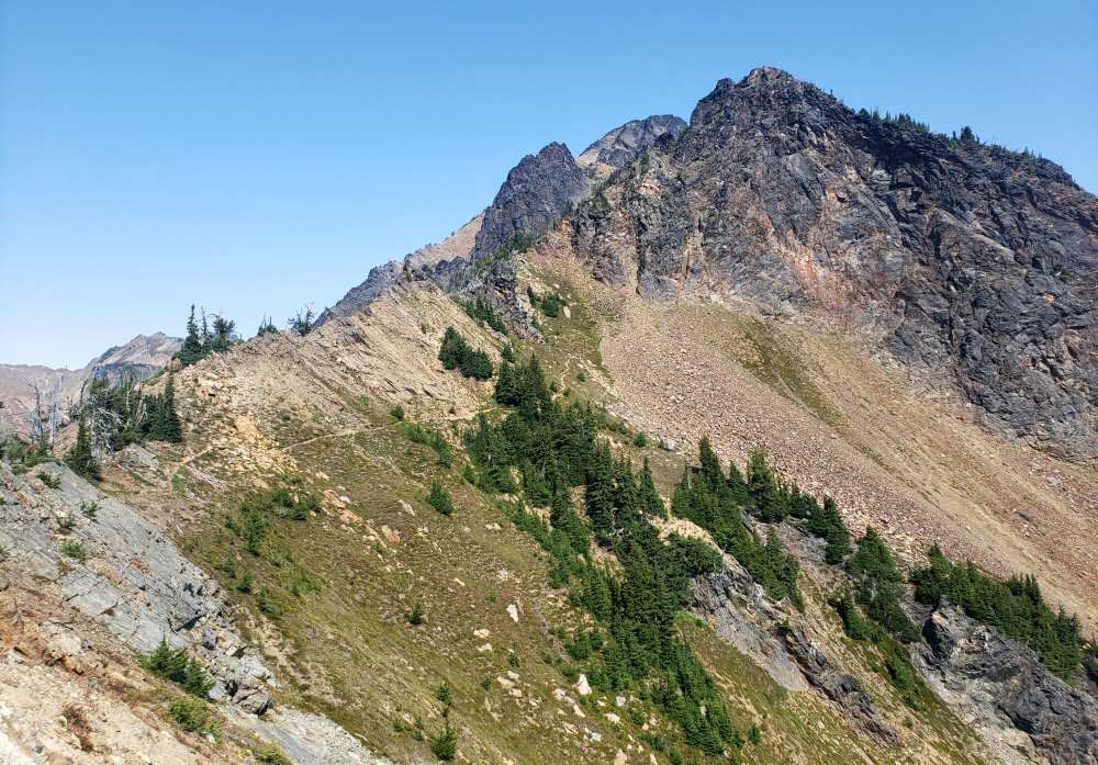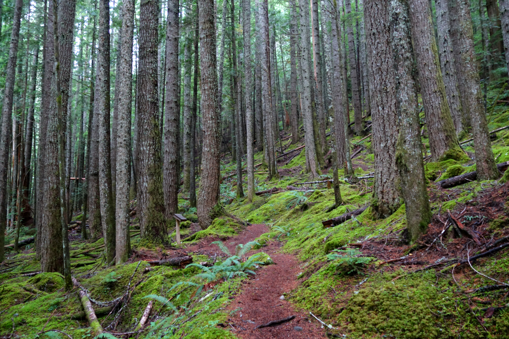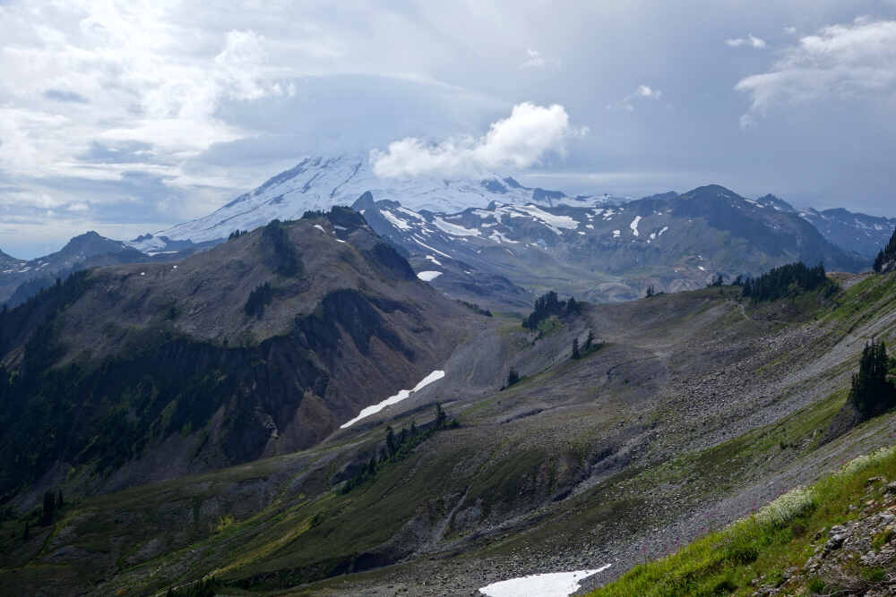 along the way as doing so has somehow eluded me all these years, before pulling into one of the campgrounds situated along the White River for the night. The sky was tinged with a distinctive orange hue, obviously thanks to forest fires burning somewhere nearby. This was punctuated by the occasional clap of thunder overhead and served as a reminder that the forecast for the next several days was for afternoon thunderstorms. Raised the camper pop-top and turned in early hoping to get a jump on whatever weather instabilities were in the offing. Completed the short drive to the trailhead the following morning and set out across the footbridge spanning White River before turning left on the Mount David Trail. South along the river for ~1.5 kilometers before turning up for a steep grind to reach a low point on David's long SE Ridge. Tight switchbacks towards the top really got the blood pumping with trees beginning to thin and allowing for nice views overlooking White River Valley and peaks beyond.