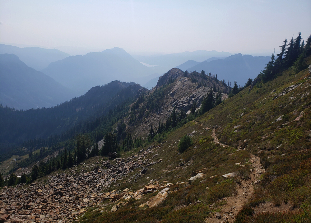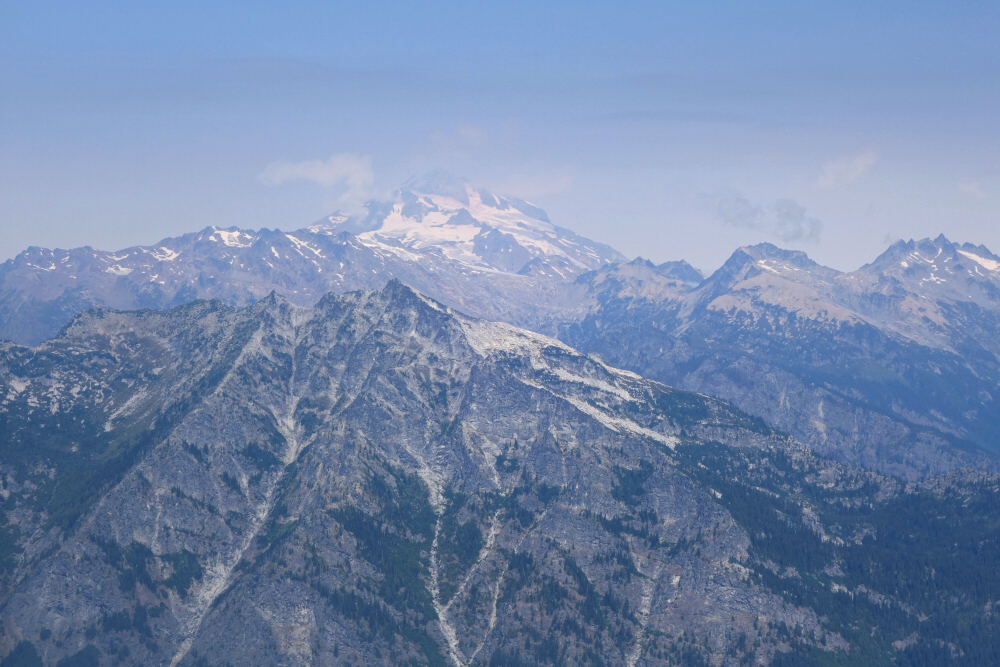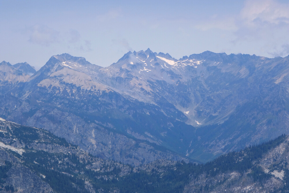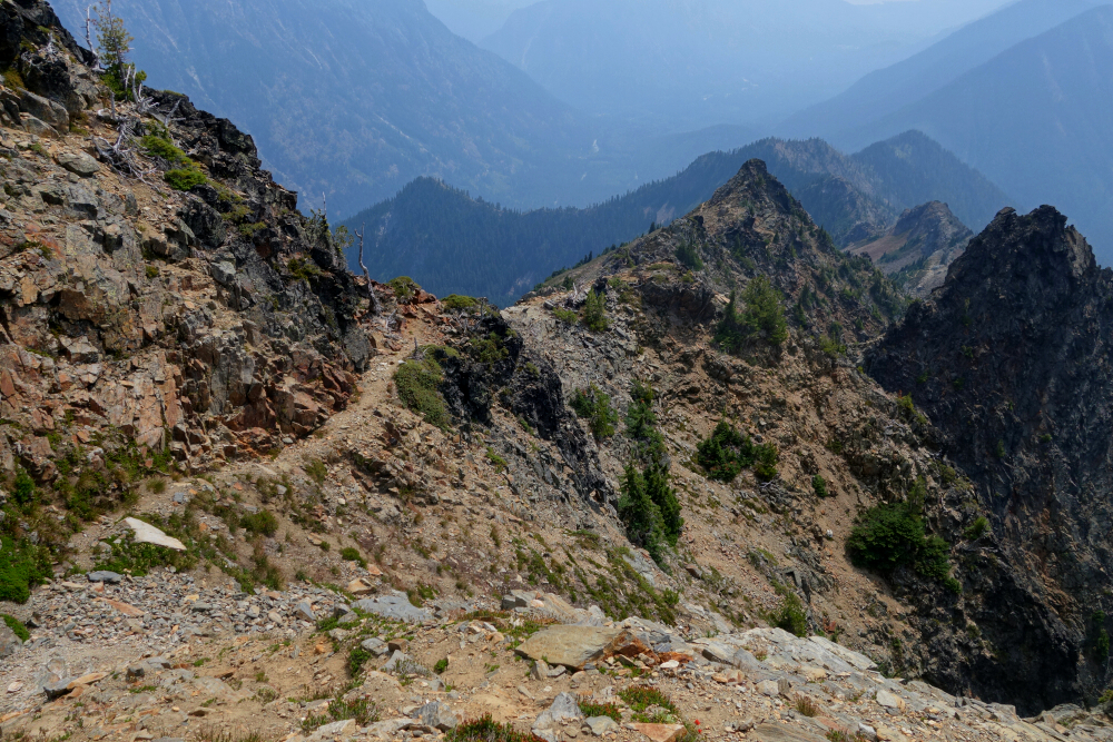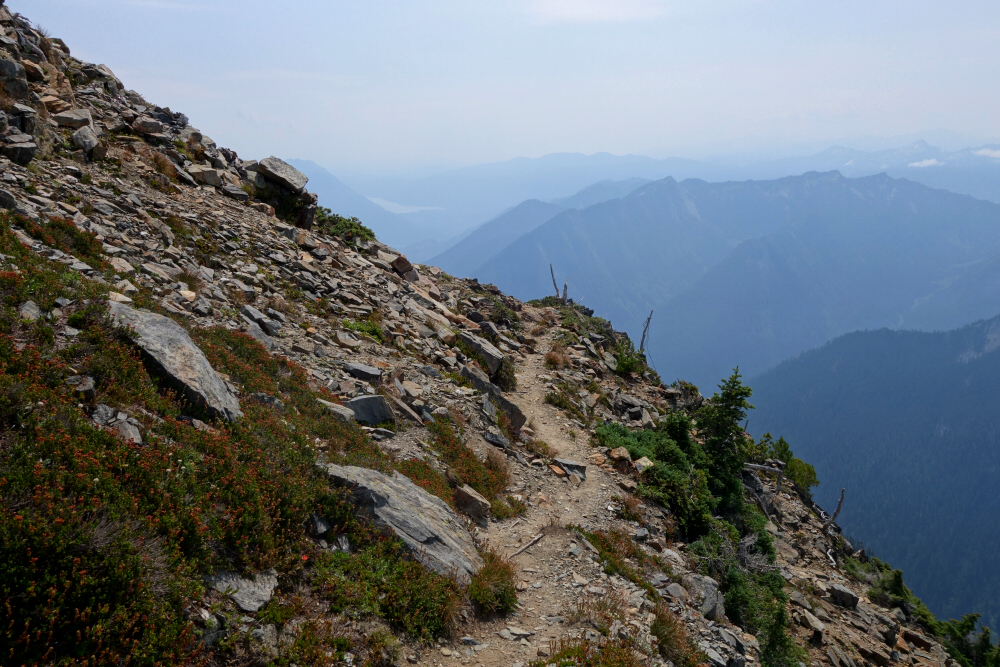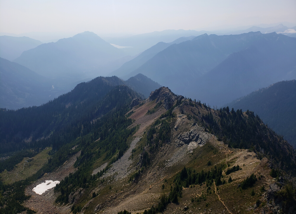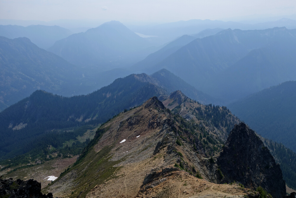 The trail now continues along and just below the crest, following the path of least resistance by weaving right or left around the occasional crag otherwise blocking the way. Higher up, the trail makes a rising traverse into a large talus basin right of the crest before turning back up to regain the ridge. Repeated this pattern once more before completing the final bit now along the south and west sides of the peak to finally reach the summit. As expected, haze and smoke obscured the view on this day, as did the clouds which were beginning to accumulate on the neighboring mountaintops. Nonetheless, still able to clearly make out the entirety of Poet's Ridge to Whittier looking west with a blanket of marine clouds obscuring the lowlands beyond. Also, Glacier Peak, Tenpeak Mountain and the rest of the Dakobed Range showing up nicely to the north, and then finally a great albeit hazy view overlooking the SE Ridge with Lake Wenatchee peeking in the distance.