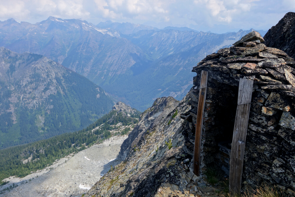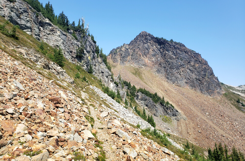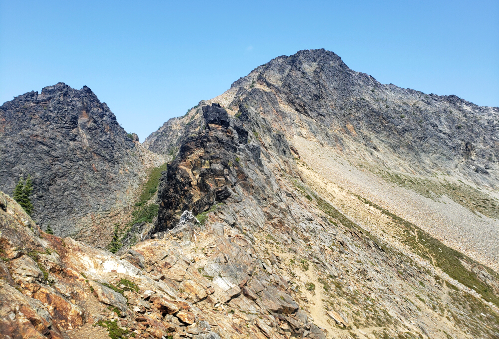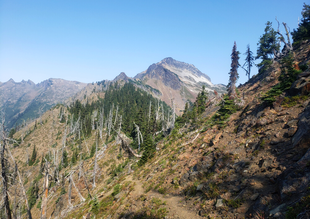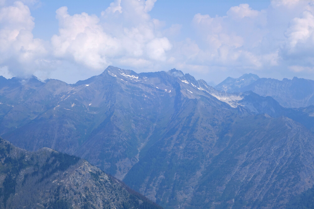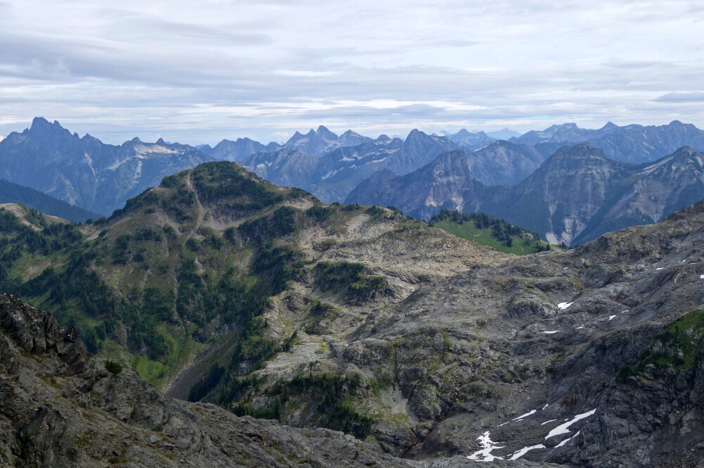 The trail now continues along and just below the crest, following the path of least resistance by weaving right or left around the occasional crag otherwise blocking the way. Higher up, the trail makes a rising traverse into a large talus basin right of the crest before turning back up to regain the ridge. Repeated this pattern once more before completing the final bit now along the south and west sides of the peak to finally reach the summit. As expected, haze and smoke obscured the view on this day, as did the clouds which were beginning to accumulate on the neighboring mountaintops. Nonetheless, still able to clearly make out the entirety of Poet's Ridge to Whittier looking west with a blanket of marine clouds obscuring the lowlands beyond. Also, Glacier Peak, Tenpeak Mountain and the rest of the Dakobed Range showing up nicely to the north, and then finally a great albeit hazy view overlooking the SE Ridge with Lake Wenatchee peeking in the distance.