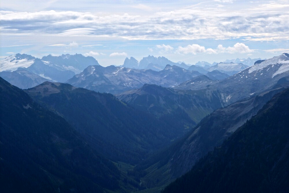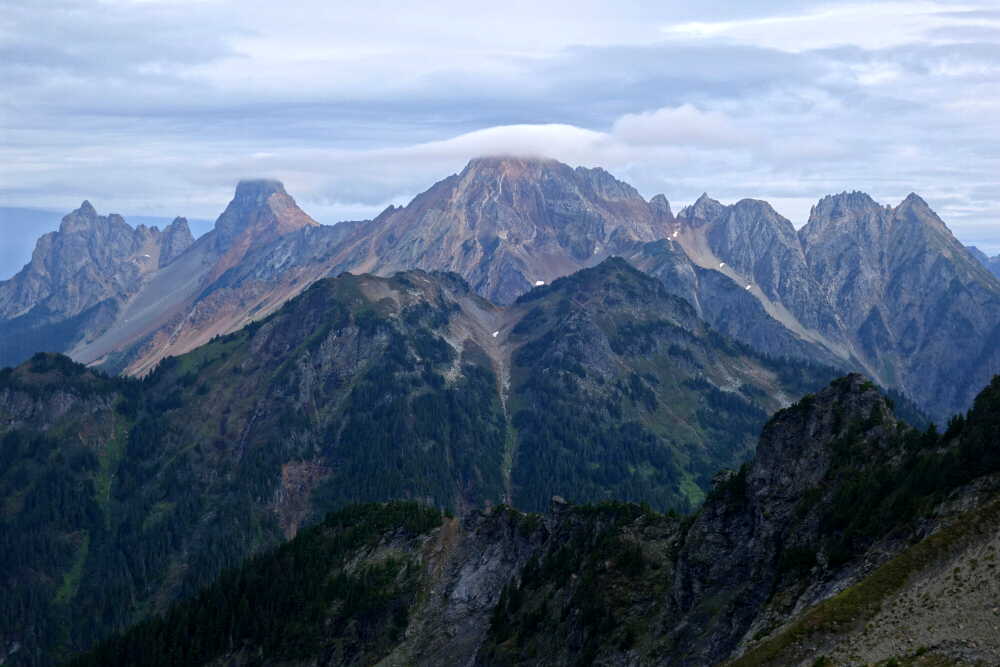 With an 8 am start, I raced up the trail and out of the forest only to see ominous dark clouds advancing from the northwest. Hmm...best to hurry along! Onwards up the South Spur for a bit before traversing the southwest-facing slopes and then along the final summit ridge with just a smidge of scrambling at the end to reach the top. A cold wind was blowing with the cloud ceiling already dropping on the higher peaks. Views still excellent and all-the-more dramatic thanks to the layered bands of atmospheric waves forming around me - north to the Border Peaks and Larrabee, south towards in-your-face Sefrit and Shuksan with Baker just beyond lording over the Nooksack River Valley, northeast towards the BC Cascades with Slesse, Rexford and company, and finally a marvelous view looking up Ruth Creek Valley with the serrated spires of the Picket Range still bathed in sunshine far to the east! And then it started to rain.