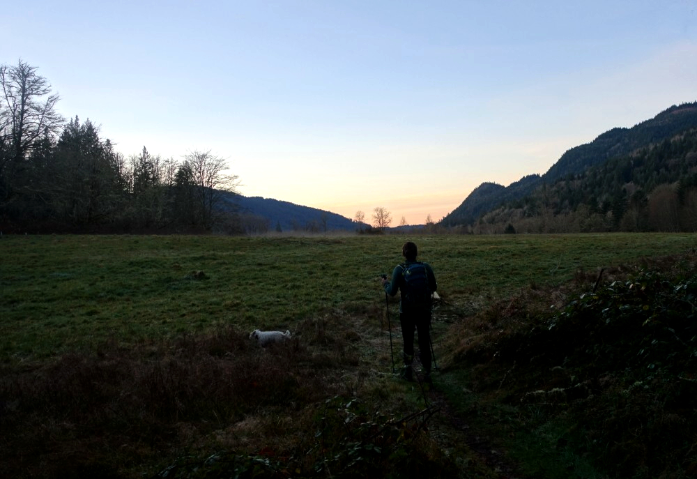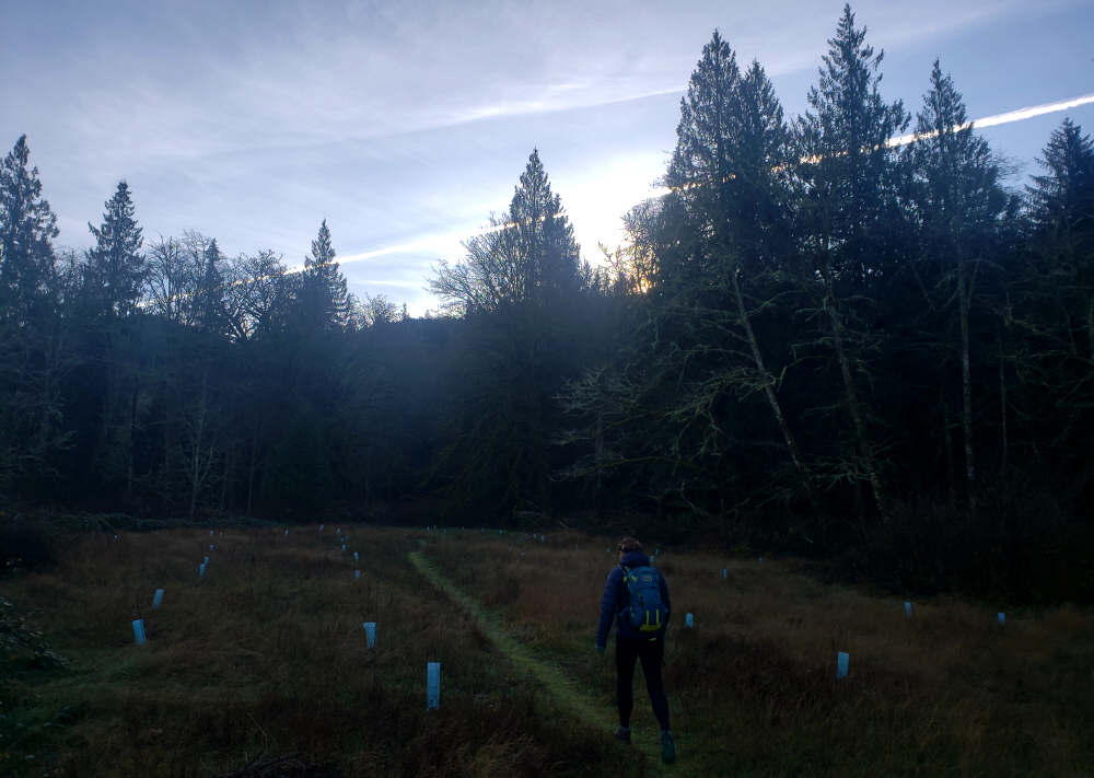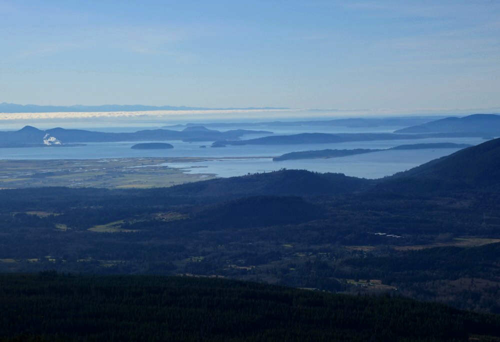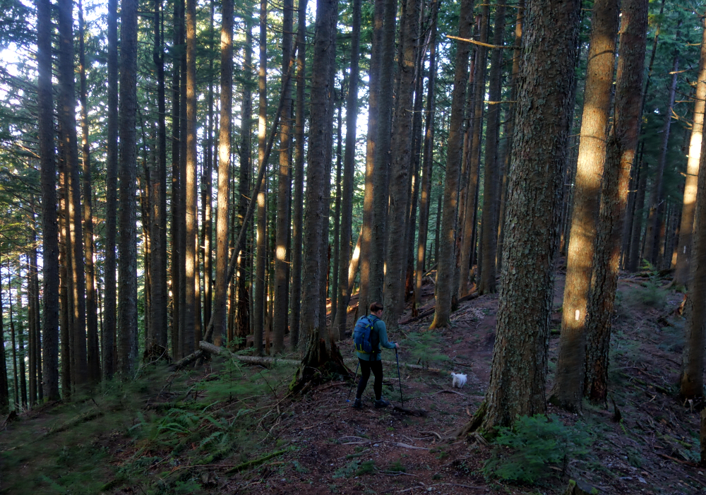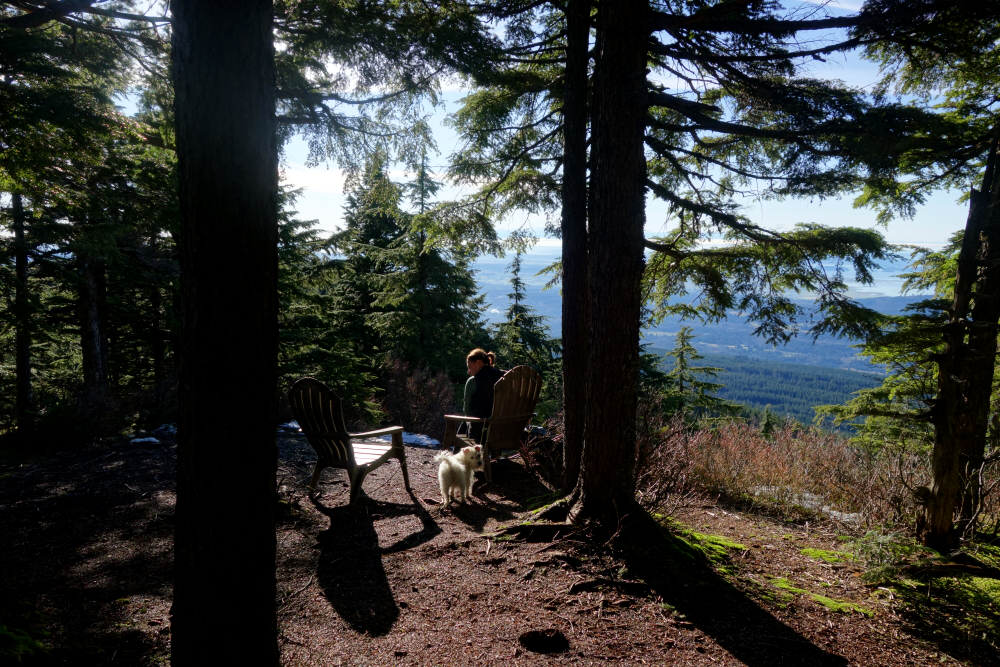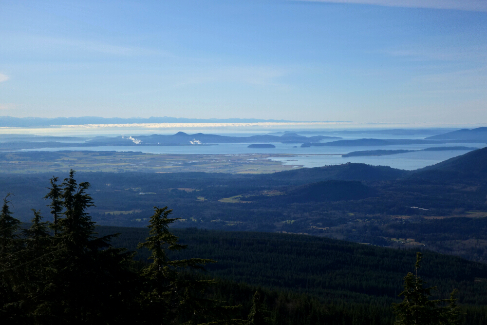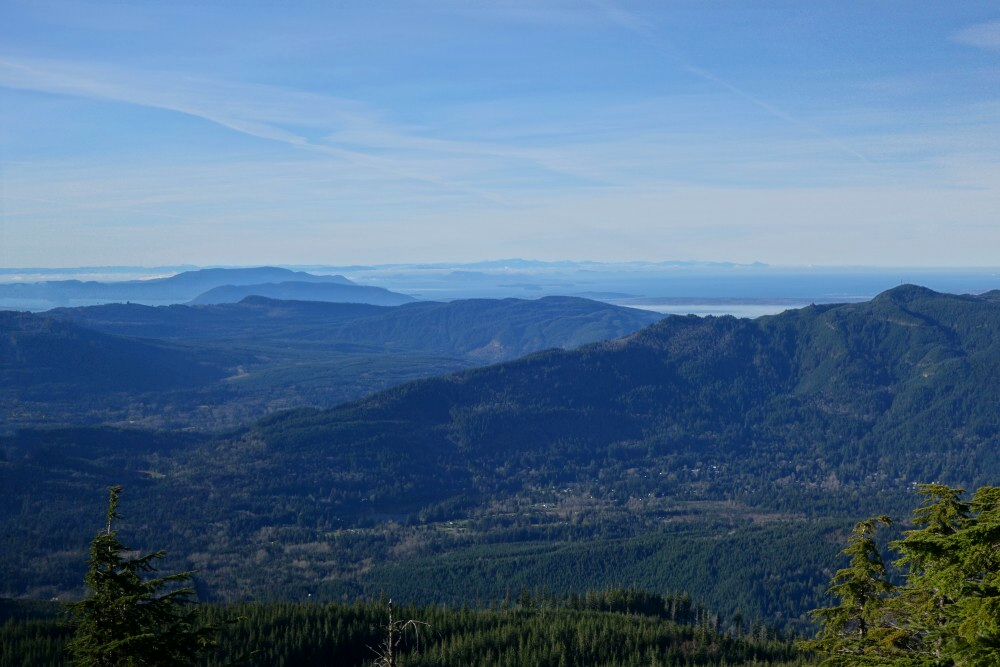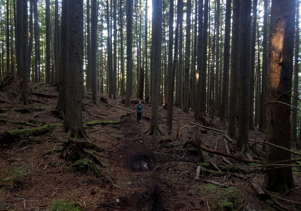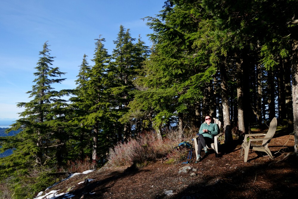 Continuing above the cutblock, the trail follows a minor spur back into the forest before easing off for a short final walk to a small lookout, complete with a couple of plastic patio chairs and fine western views out toward the San Juan Islands and beyond. We cracked a couple of beers and soaked in the weak sunshine as it cast a warm orange glow over our little perch. A trail continues beyond this point and appears to descend to intersect a forest road coming up from the south-again, likely more of an MTB route than anything else. The true summit lies somewhere beyond, reportedly viewless and likely trailless, so we didn't bother pushing any farther.