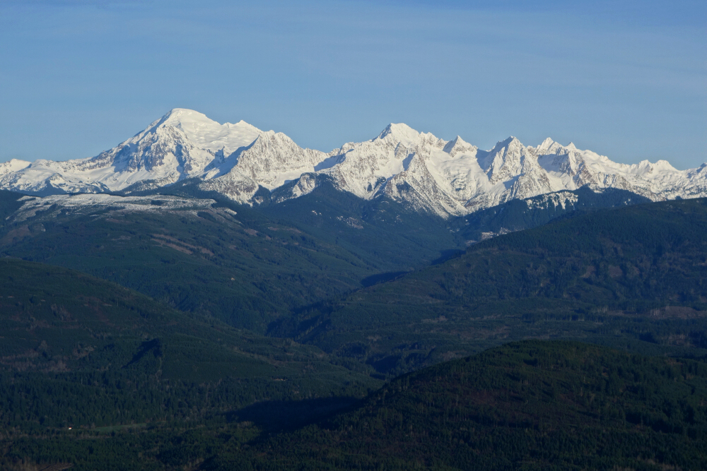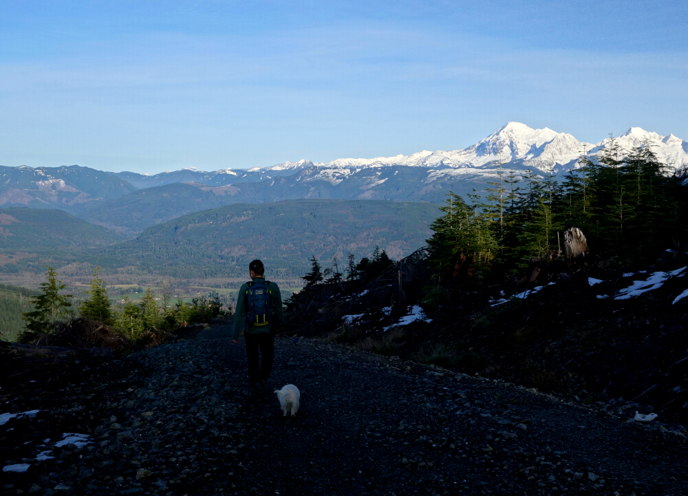 From an unmarked trailhead off South Bay Drive, the route passes through an open field before turning upward into the forested north-facing slopes of Anderson. Arguably more of an MTB downhill track, it makes for a sometimes steep and sustained grunt up to a large cutblock area about 0.75 kilometres shy of the "summit." From here, a surprisingly good view opens over Whatcom Lake, with Mount Baker and the Twin Sisters Range standing out beyond.