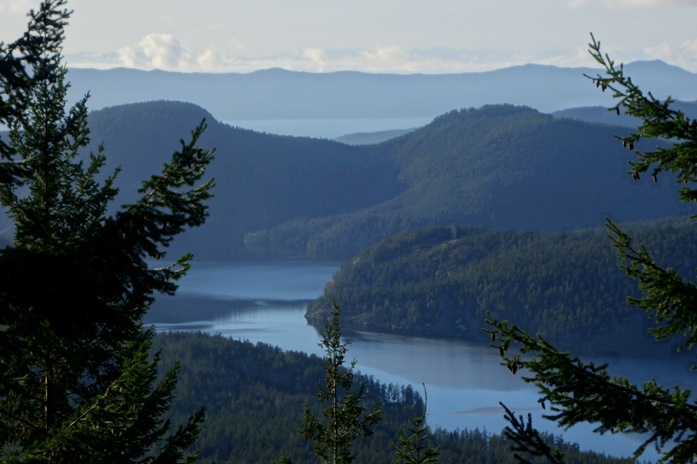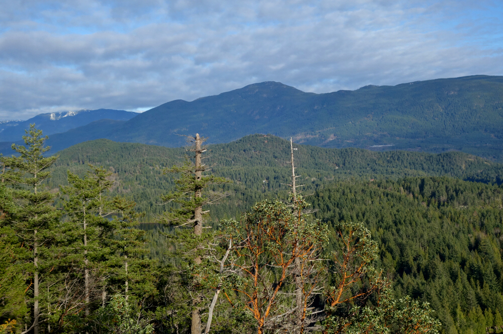 Second time's the charm at Belcarra, returning primarily for the views I'd been denied on my first visit. With no low-lying fog this time, I made my way over to Belcarra Regional Park for a quick couple of hours of wandering in the woods. The true summit is fully treed, as one might expect for such a modest peak, but the real appeal lies at a lookout on a minor bluff just west of the high point. From there, a fine view opens over the mouth of Indian Arm, looking down Burrard Inlet toward the distant city skyline.
