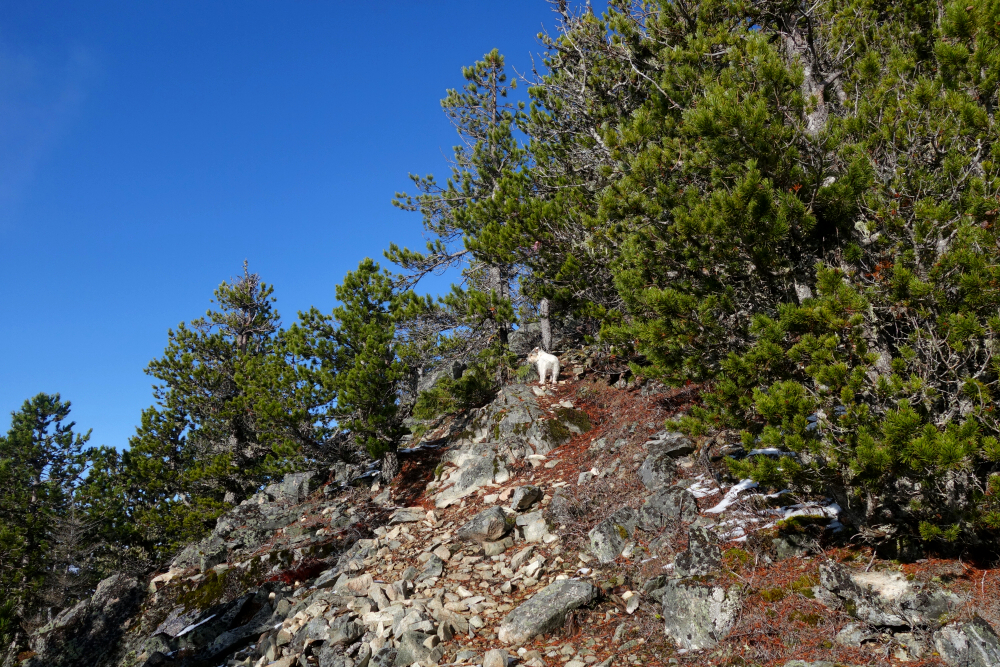 Beaten but not defeated, I resolved to return someday. First, though, I needed to let the memory of the approach trail fade a little. Factoring in Evans Peak, I'd already been at least most of the way to Alouette three times, and I'm not much for repeats-let alone four. Eventually, the stars aligned for redemption in October 2024, this time with Andrew along for the ride. Once again, we set off from the West Canyon Trailhead and began the familiar, steep, and somewhat monotonous grind toward Alouette. Between Alouette and Blanshard lies a deep chasm choked with brush, though a faint trail winds its way through the worst of it. I'd previously scoped out where to begin the descent into this chasm: just south of Alouette's summit, along the right-hand edge, following a small dry watercourse that turns into a loose and unpleasant gully farther down. I don't recall any flagging marking the entrance, though there were some markers lower down.