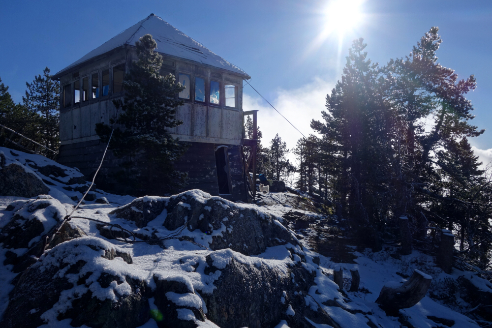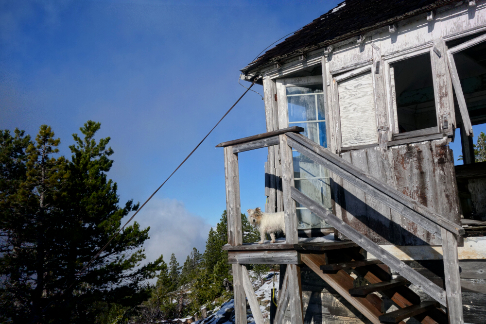 While the sunshine was appreciated, the hoped-for views remained frustratingly elusive. A blanket of low cloud obscured most of the surrounding landscape, with only occasional glimpses appearing through drifting gaps. I lingered for about an hour in hopes things might clear, but it was largely in vain. At least Pepper made the most of it-bounding around in the light dusting of snow and poking around the slowly collapsing lookout. Eventually, with little sign of improvement, I packed up and started the descent, retracing my steps down the cold forest roads back to the truck. Win some, lose some they say-Pepper clearly enjoyed this much more than I did!