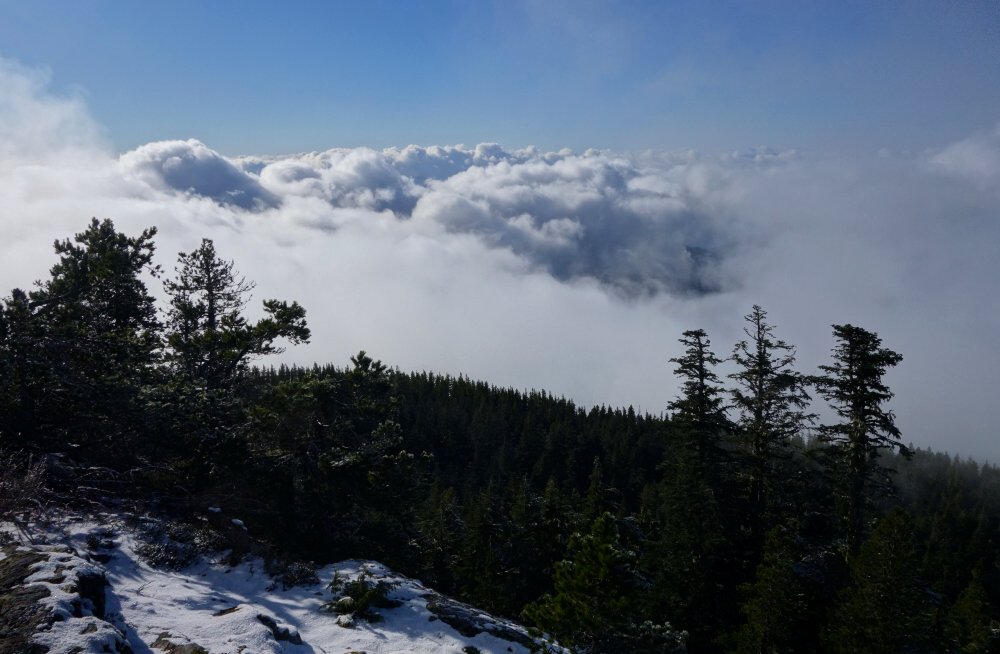 I turned right off the highway just before Sakinaw Lake Road and began climbing a surprisingly rough and steep FSR labeled "High School Confidential" on CalTopo. Not entirely sure what that's about, but I followed it as far as I was willing before parking and continuing on foot. What followed was a fairly monotonous grind up the road-left at a junction, then more cold, shaded walking before finally reaching the actual trailhead. From there, less than a kilometre remained to the summit. The final stretch climbed steadily, eventually breaking above the cloud layer into welcome sunshine and blue skies. I reached the summit and lookout just over two hours after leaving the truck.