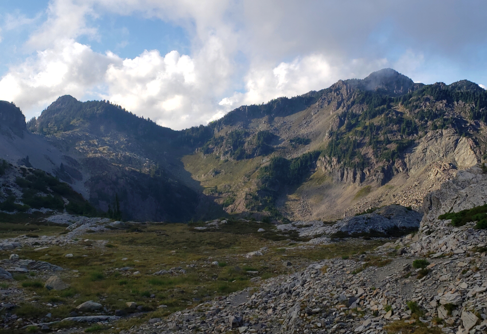 We enjoyed a leisurely start the next morning, traversing slightly rightward from our camp saddle into Nichols Creek Valley. Hoping to avoid losing more elevation than necessary, we stayed well left of the main creek drainage by contouring along the west side of the valley over mostly heather, steering clear of the large talus slopes above. We were forced to skirt around the toe of at least one sizable talus wash before resuming our otherwise pleasant trek toward Griswold Pass, where we expected to rendezvous with the rest of our party. Upon reaching a pass-like area dotted with numerous lakes, with a large lateral moraine blocking our view northward, we decided to stop and set up our tents for the night. We were in the general area of the pass and figured there was nothing but talus ahead, so we might as well stop where pitching tents was easy. No sign of Wes and company, and not really in the mood to go searching at that point either.