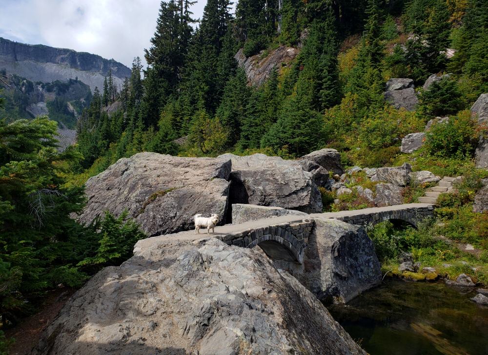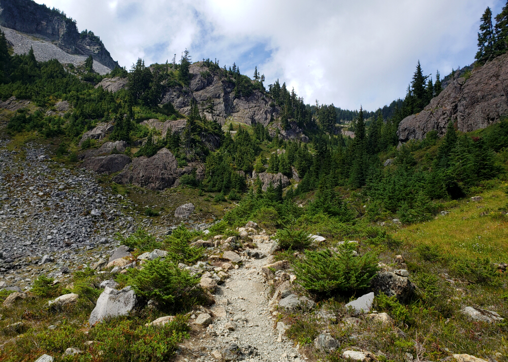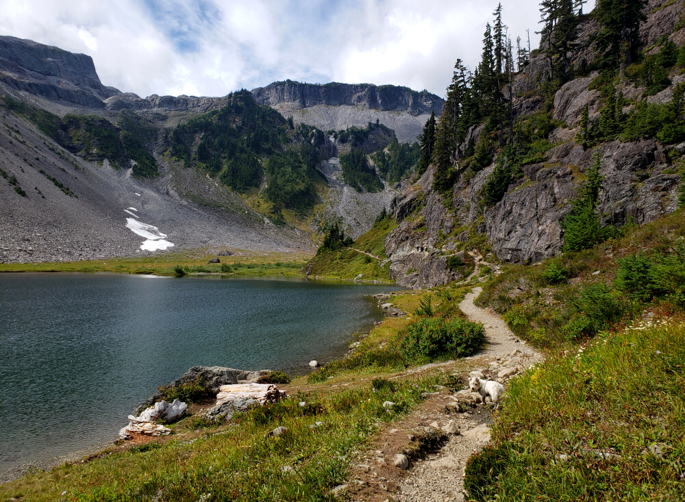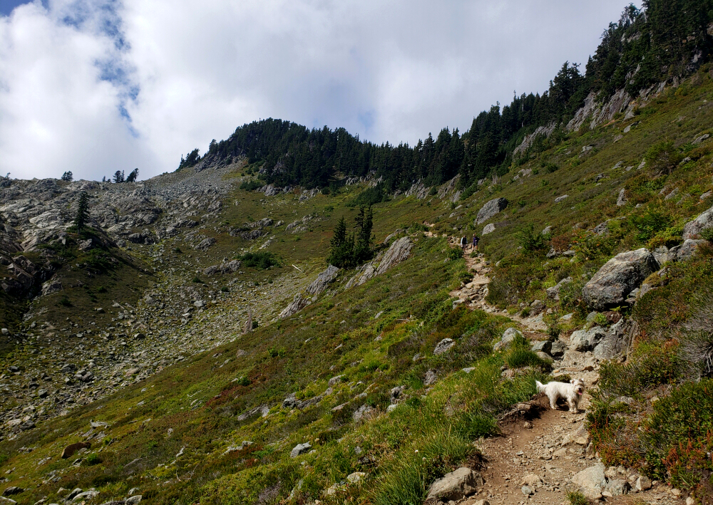Approaching Picture Lake, the clouds were slowly starting to part, with tantalizing patches of blue showing through. Hmm...not expected. Perhaps sensing my sudden restlessness, Agata suggested I take Pepper for a quick hike somewhere nearby while she hung back and listened to her audiobook. I'd been through the Bagley Lakes basin several times before, but always in winter, usually returning from a day of ski touring out in the Ptarmigan Ridge backcountry. It would be nice to finally see what it looks like without snow, I figured, and so-with puppers in tow-down from the parking lot to Bagley Creek we went.