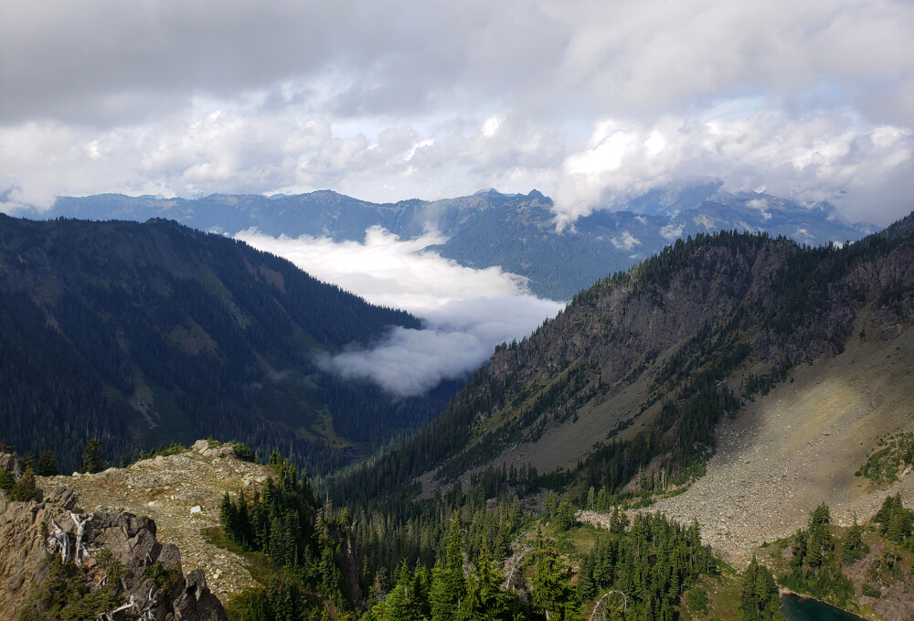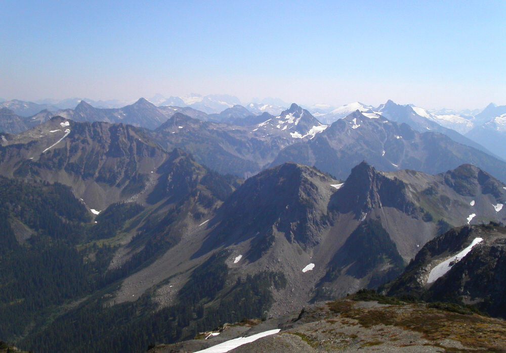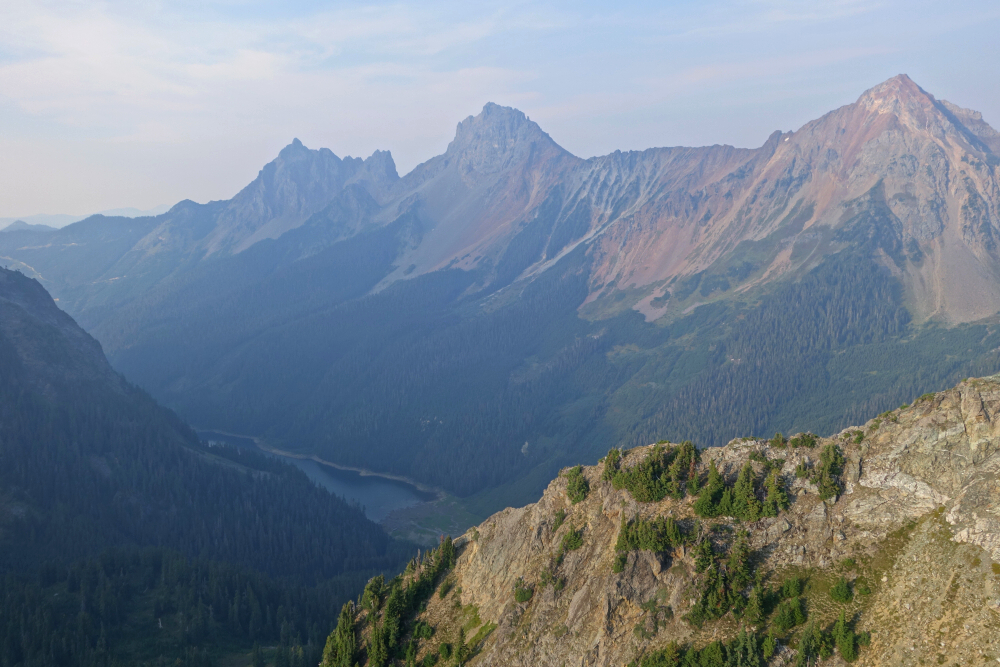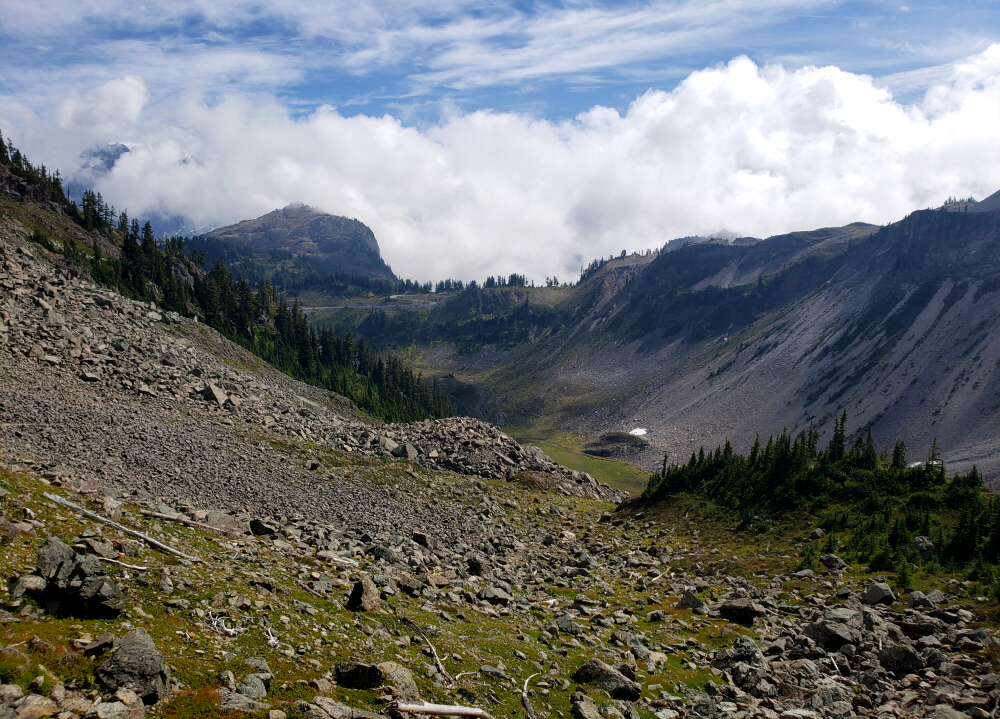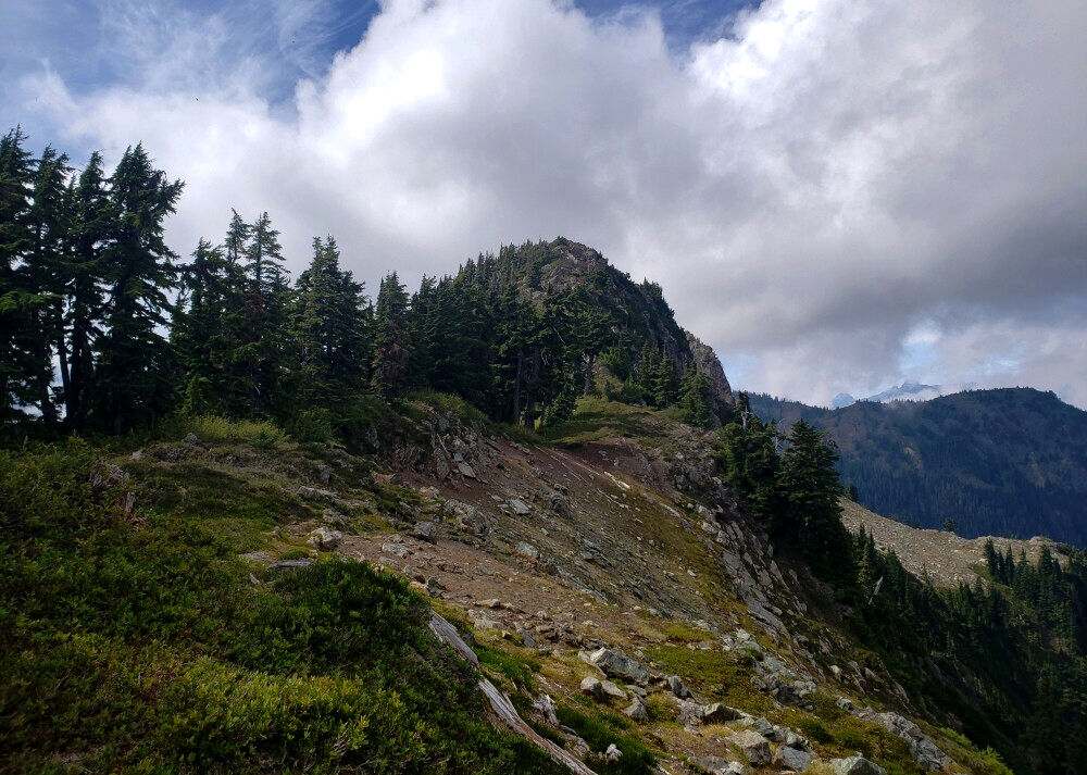 The trail now continues along and just below the crest, following the path of least resistance by weaving right or left around the occasional crag otherwise blocking the way. Higher up, the trail makes a rising traverse into a large talus basin right of the crest before turning back up to regain the ridge. Repeated this pattern once more before completing the final bit now along the south and west sides of the peak to finally reach the summit. As expected, haze and smoke obscured the view on this day, as did the clouds which were beginning to accumulate on the neighboring mountaintops. Nonetheless, still able to clearly make out the entirety of Poet's Ridge to Whittier looking west with a blanket of marine clouds obscuring the lowlands beyond. Also, Glacier Peak, Tenpeak Mountain and the rest of the Dakobed Range showing up nicely to the north, and then finally a great albeit hazy view overlooking the SE Ridge with Lake Wenatchee peeking in the distance.