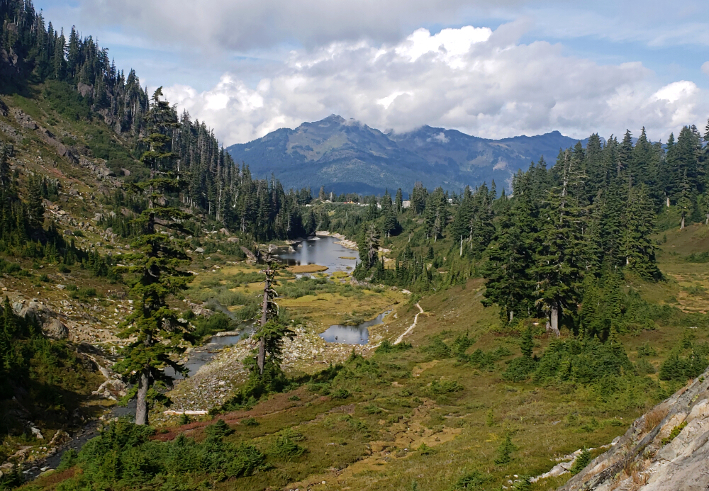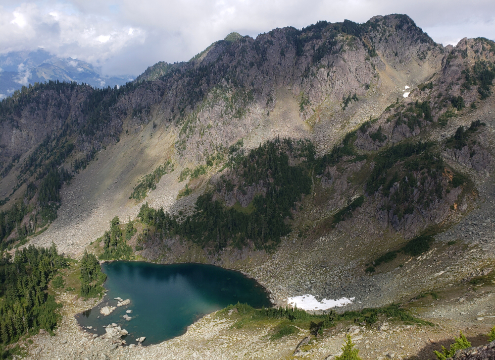 A decent 360-degree panorama awaited from the partially treed summit, especially considering it tops out at a rather lowly 5,820 feet. The afternoon sun was doing its best to burn off the stubborn clouds swirling around neighboring mountaintops, but I couldn't linger long enough for that to fully materialize. Still, there were nice views toward Shuksan slowly emerging from its blanket of cloud, the craggy south face of Mount Herman, and down Anderson Creek Valley to the north. To the south, Table Mountain dominated the skyline, with a trio of lakes-Iceberg, Hayes, and Arbuthnet-spread out below to the southwest. I returned via the low saddle between Mazama Dome and Mount Herman before rejoining the trail for the quick hike back to the parking lot. All in all, a very worthwhile couple of hours farting about the Bagley Lakes area.