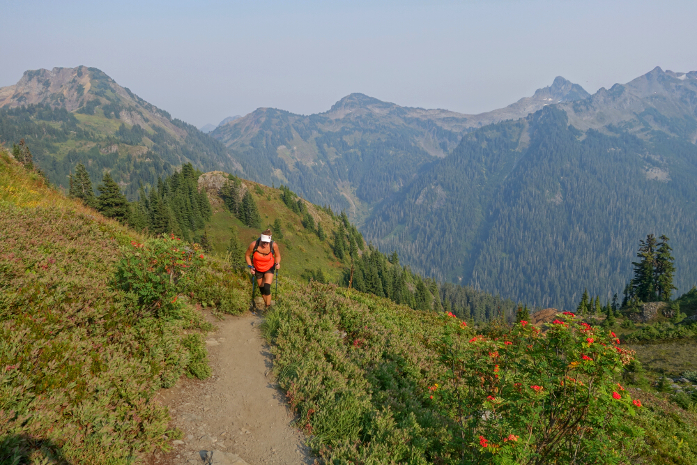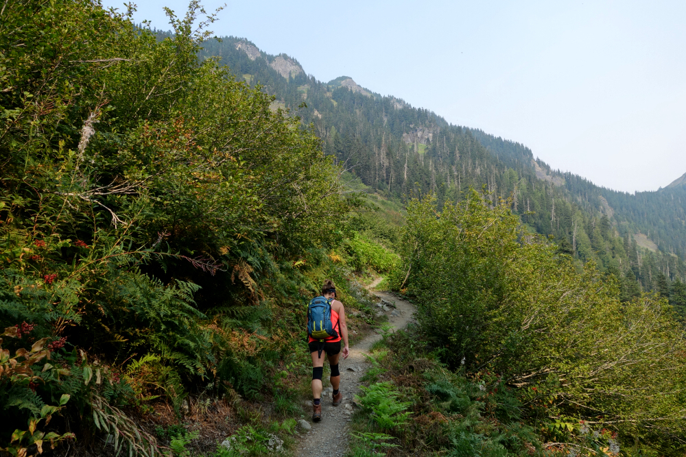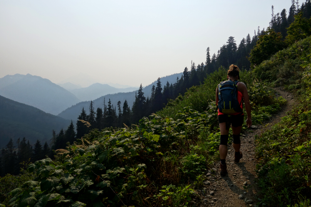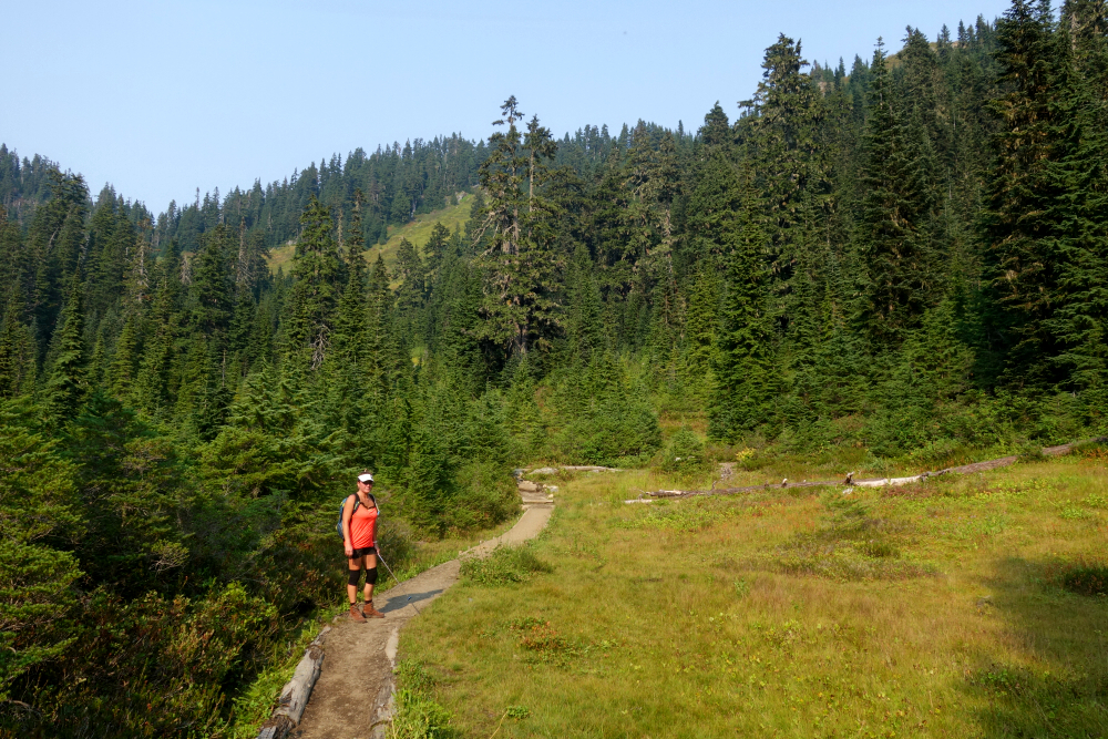 along the way as doing so has somehow eluded me all these years, before pulling into one of the campgrounds situated along the White River for the night. The sky was tinged with a distinctive orange hue, obviously thanks to forest fires burning somewhere nearby. This was punctuated by the occasional clap of thunder overhead and served as a reminder that the forecast for the next several days was for afternoon thunderstorms. Raised the camper pop-top and turned in early hoping to get a jump on whatever weather instabilities were in the offing. Completed the short drive to the trailhead the following morning and set out across the footbridge spanning White River before turning left on the Mount David Trail. South along the river for ~1.5 kilometers before turning up for a steep grind to reach a low point on David's long SE Ridge. Tight switchbacks towards the top really got the blood pumping with trees beginning to thin and allowing for nice views overlooking White River Valley and peaks beyond.