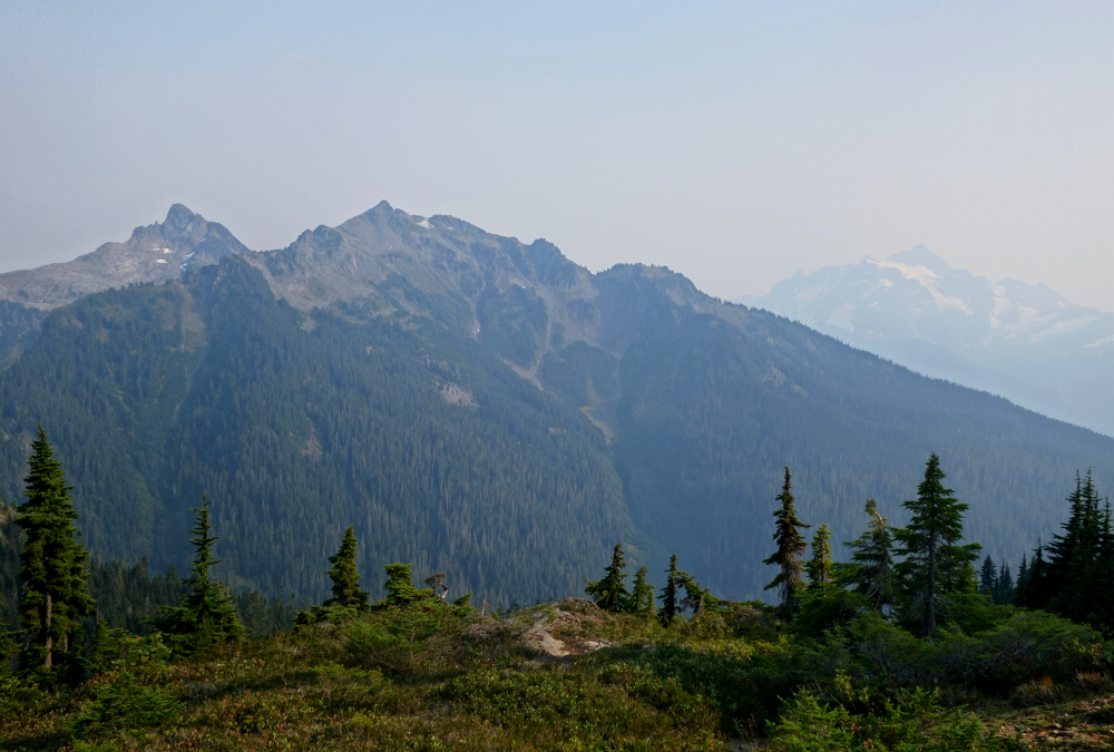 A wonderful 360-degree panorama awaited us on top, with the Border Peaks-Larrabee Group hard to miss to the north. Goat Mountain also showed nicely to the southeast, with Mount Shuksan visible behind despite the smoky haze. About 2.5 hours one-way at a casual pace, we were back at the trailhead by 8 p.m., with just enough daylight left to make it to a nearby campground before nightfall. All told, YAB made for a near-perfect late-afternoon outing: straightforward access, delightful terrain, and big views for modest effort. Smoke or not, it's easy to see why this area remains so popular, and why it keeps drawing me back even after multiple visits. A solid way to kick off a few relaxed days of wandering around Bakerland.